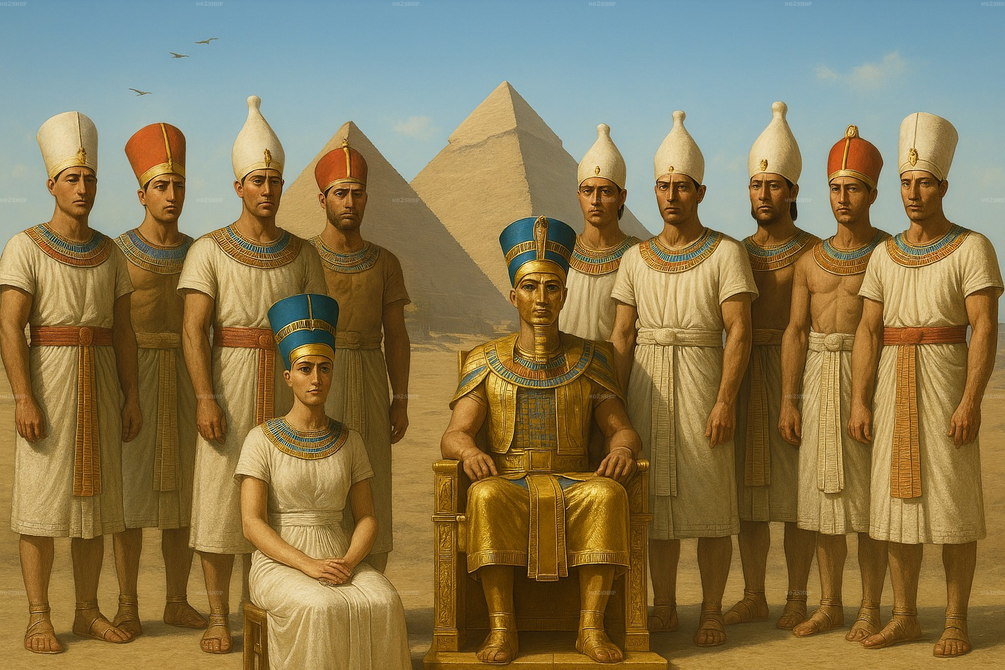 Step into a timeless scene where Egypt's greatest rulers gather beneath the morning sky. "Legacy of the Pharaohs – Morning at the Pyramids" is a hyper-realistic digital painting that brings together ten legendary Egyptian monarchs in one unforgettable moment.